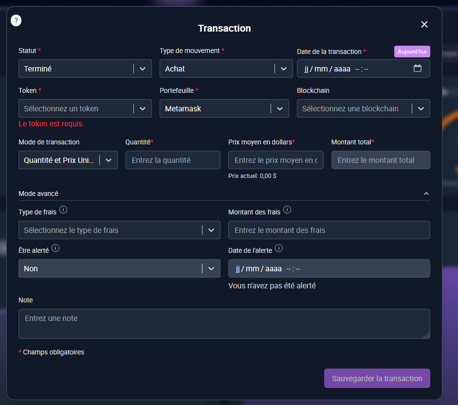 Date de la transaction : Astuce : cliquez sur Aujourd’hui pour mettre la date du jour