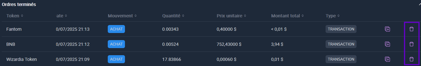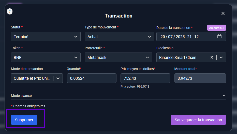 ⚠️ Important : toute suppression est définitive. Assurez-vous que vous voulez vraiment supprimer la transaction.