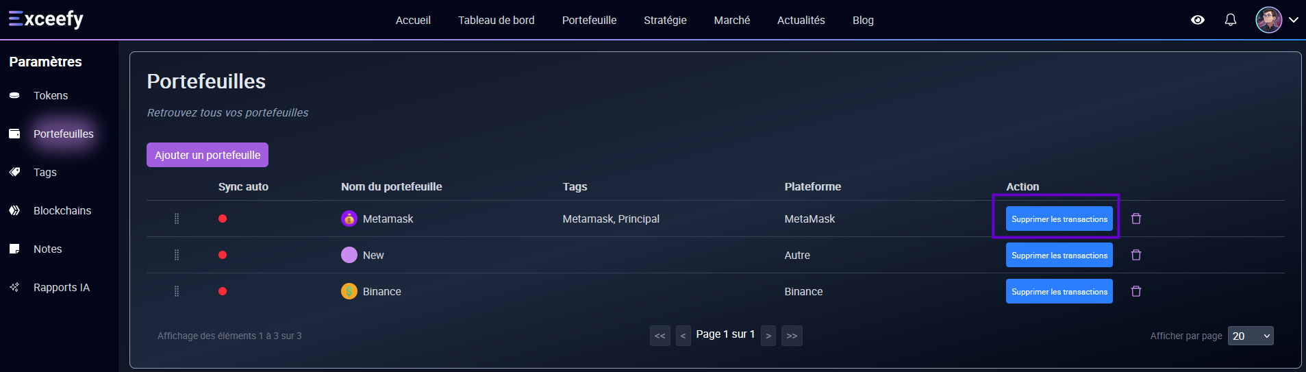 Pour supprimer toutes les transactions d’un portefeuille dans Exceefy :