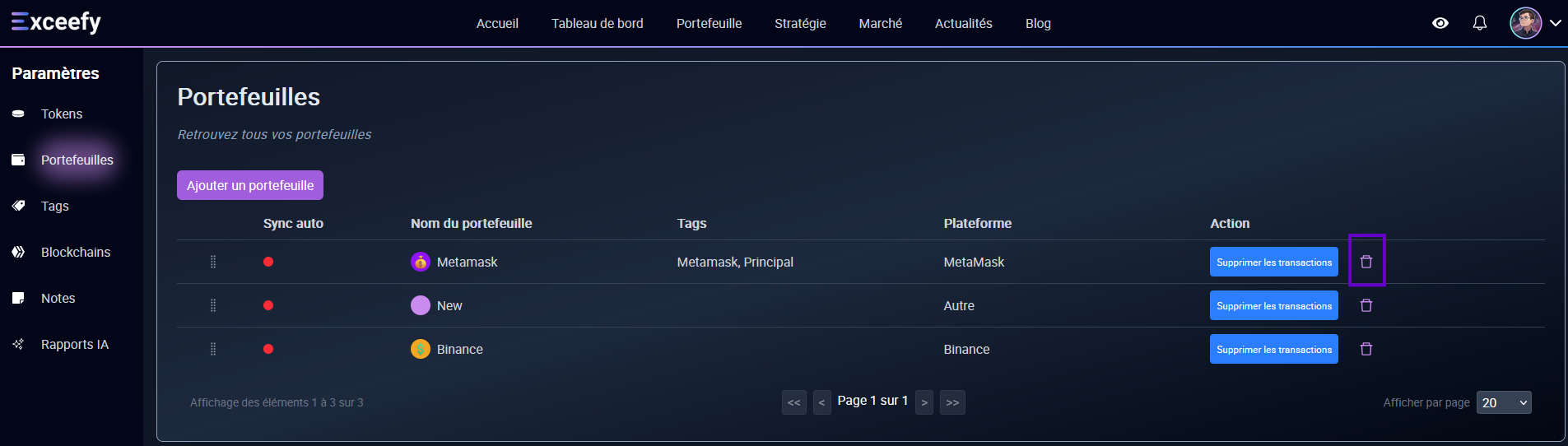 Supprimez facilement un portefeuille depuis vos paramètres Exceefy en quelques clics.