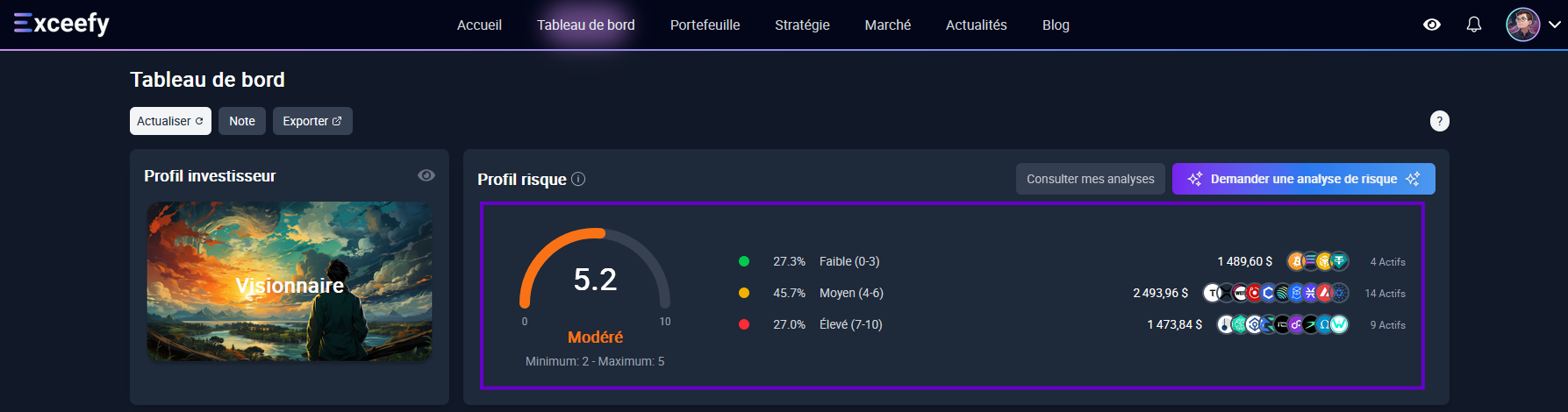 Visualisez le risque global de votre portefeuille selon vos tokens et votre profil investisseur.