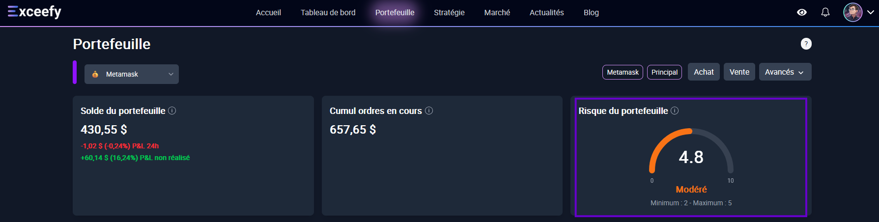 Dans l’onglet Portefeuille → Niveau de risque pour chaque portefeuille.